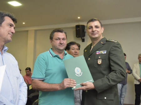 Durante a posse, o prefeito fez o juramento diante da Bandeira Nacional para cumprir os deveres relativos ao Serviço Militar no município e na sequência recebeu o diploma de presidente da Junta de Serviço Militar.