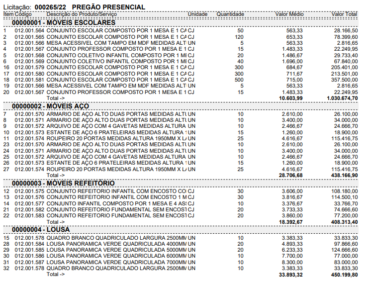 Registro de preços de mobiliário e outros equipamentos para a educação - Pregão Presencial Nº. 087/2022 - Processo Licitatório Nº 265/2022