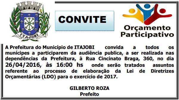 A Prefeitura do Município de ITAJOBI convida a todos os munícipes a participarem da audiência publica, a ser realizada nas dependências da Prefeitura, à Rua Cincinato Braga, 360, no dia 26/04/2016, às 16:00 hs onde serão tratados assuntos referente ao processo de elaboração da Lei de Diretrizes Orçamentárias (LDO) para o exercício de 2017.