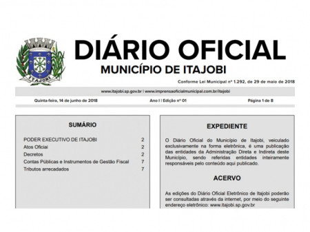 A Administração do Município de Itajobi implantou nesta quinta-feira (14) o Diário Oficial Eletrônico do Município. Criada pela Lei nº 1.292/2018, a Imprensa Oficial do Município ou “Diário Oficial” passa a ser o órgão oficial de divulgação dos atos da Administração Municipal Direta e Indireta.