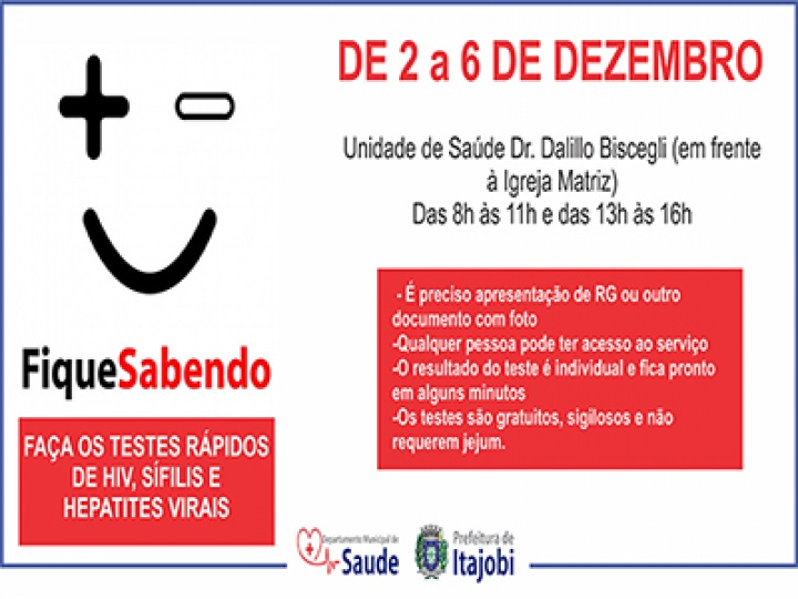 O Departamento Municipal de Saúde realiza, de 2 a 6 de Dezembro, a Campanha Fique Sabendo no município de Itajobi.