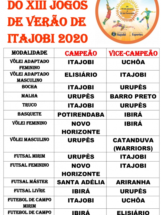 “Parabenizamos a todos os atletas, professores e coordenadores de cada cidade por fazerem os Jogos de Verão de 2020 um sucesso”, destacaram os representantes do Departamento Municipal de Esportes de Itajobi.