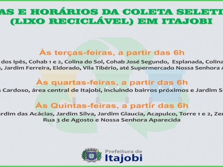 A Coleta Seletiva é realizada em todos os bairros de Itajobi, quando a população pode contribuir com a separação, organização e disposição do lixo para a coleta seletiva.