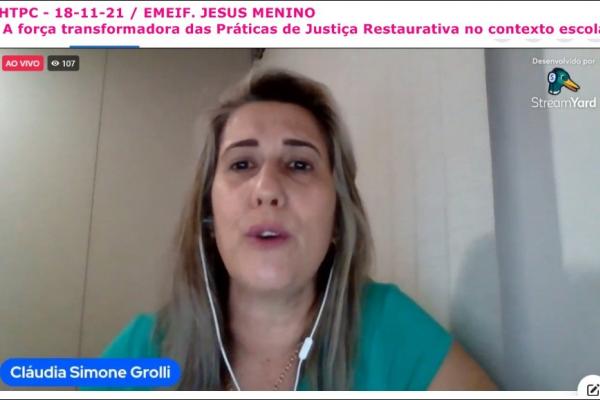 E como convidada especial para falar das experiências realizadas por ela nas escolas e no Núcleo Comunitário da JR, de Cascavel- PR, a Professora facilitadora Claudia Simone Grolli. Durante a palestra, Clauudia esclareceu passo a passo as definições da JR, a Teoria, as Práticas Circulares, os desafios, exemplos da comunicação não violenta, que são utilizadas na comunicação com as pessoas ou , crianças e adolescentes as transformações de Cultura de Paz que a Justiça Restaurativa promove, Integrar a JR nos espaços institucionais escolares, quando aderido por todos se obtém ótimos resultados, principalmente com as crianças e adolescentes.