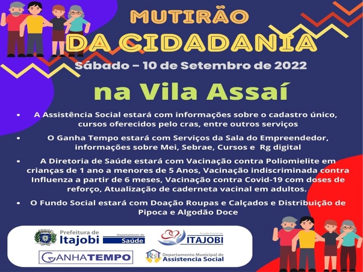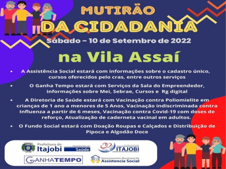 A Prefeitura de Itajobi, em parcerias com o Fundo Social, o Departamento Municipal de Saúde, Ganhatempo e o Departamento Municipal de Assistência Social realiza, no sábado (10), o projeto ‘Mutirão da Cidadania’, no bairro rural Vila Assaí.