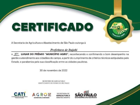 A premiação foi realizada no Palácio dos Bandeirantes em São Paulo, durante a Cerimônia de lançamento do ranking e premiação dos municípios certificados no Programa Município Agro – Ranking Paulista/Ciclo 2021/2022. Os funcionários João e Mateus representaram a Casa da Agricultura de Itajobi durante o evento.