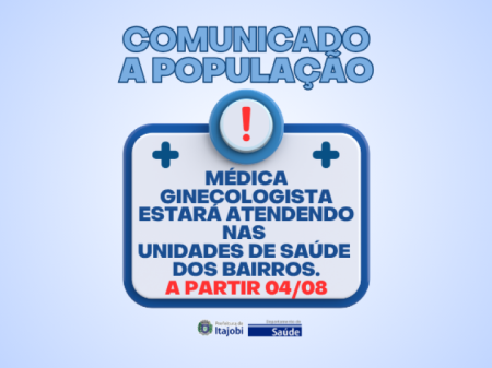 A partir de 04 de agosto, a MÉDICA GINECOLOGISTA estará atendendo nas Unidades de Saúde dos bairros, facilitando o acesso das mulheres ao cuidado especializado pertinho de casa.