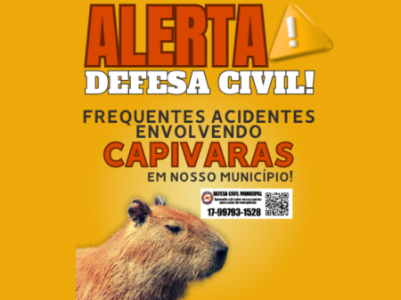 A Defesa Civil ALERTA para os recentes e freqüentes acidentes envolvendo capivaras no trecho entre o bairro da Lagoa Limpa e Distrito de Roberto, Vicinal Paulo Barbizan.