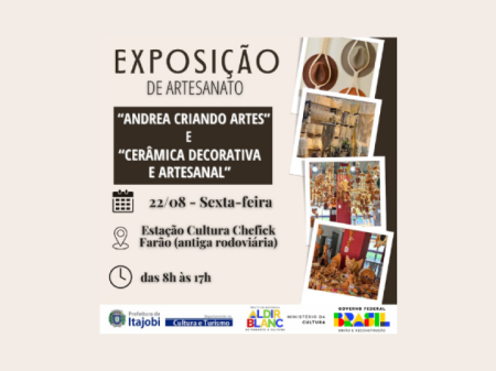 Na próxima sexta-feira, 22/08, acontece a Exposição de Artesanato “Andrea Criando Artes” e "Cerâmica Decorativa e Artesanal", na Estação Cultura Chefick Farão (antiga rodoviária).